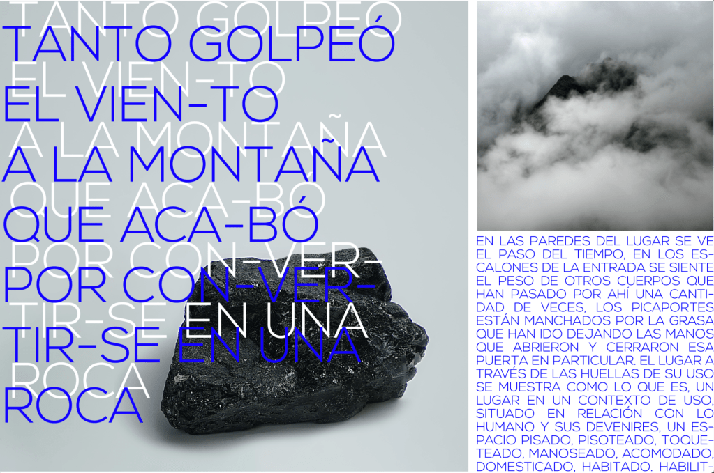 Tanto golpeó el viento a la montaña que acabó por convertirse en roca* es una pieza en donde un performer deviene-con el espacio y entabla una amistad con el lugar a través de reiteradas visitas a lo largo de casi un año. Así, confabulando encuentros, emerge una relación que habilita un habitar el espacio, un conocer el lugar, un escuchar sus historias, sus materiales, sus pasos, sus ritmos. Así se habilita y se habita un otro tiempo, un tiempo en relación. Primero el piso y sus movimientos, segundo las paredes y sus bordes desbordados, y tercero el techo y sus cuidados.